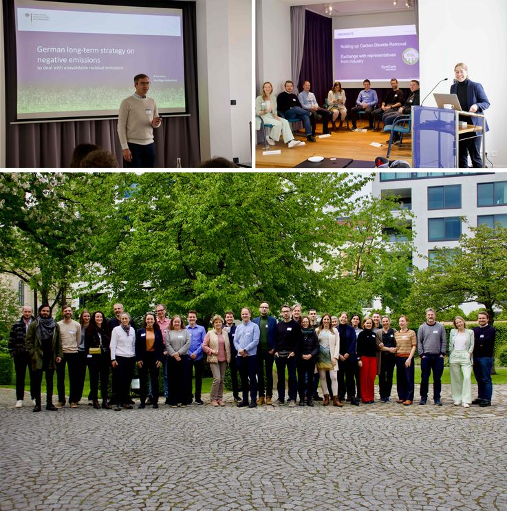 i) Jörg Rüger stellt die deutsche Langzeit-Strategie für Negativemissionen dar. ii) Ideenaustausch bei einer Podiumsdiskussion zwischen neun Industrie-Stakeholdern und den anwesenden Wissenschaftler:innen. iii) Teilnehmende von 6 Helmholtz Zentren und 8 Firmen im historischen Garten des Magnus-Hauses-Berlin. © Helmholtz/SynCom