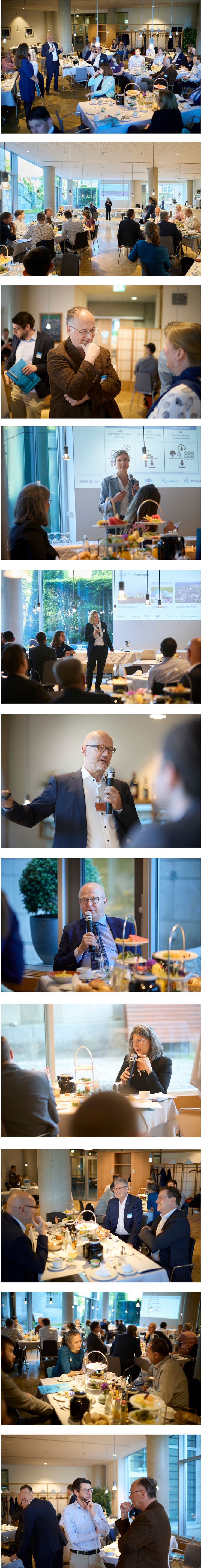 i) Parlamentarisches Frühstück „Klimaneutralität 2045 – Chancen und Herausforderungen von DACCS und BECCS“ am 17. Mai 2024 im Deutschen Bundestag. ii) Dr. Nina Scheer begrüßt die Anwesenden zum parlamentarischen Frühstück. iii) Prof. Dr. Klaus Wallmann im Gespräch mit Gästen. iv) Prof. Dr. Julia Pongratz führt in das Thema Carbon Dioxide Removal (CDR) ein. v) Prof. Dr. Daniela Thrän referiert über Bioenergie mit Carbon Capture and Storage (BECCS). vi) Prof. Dr. Roland Dittmeyer bei seiner Präsentation über Direct Air Capture. vii) Michael Theurer (parl. Staatssekretär für Digitales und Verkehr) diskutiert über CDR. viii) Schirmherrin Dr. Nina Scheer diskutiert mit den Anwesenden. ix–xi) Nach den Vorträgen und der Diskussionsrunde entfaltete sich ein reger Austausch zwischen Vortragenden, Bundestagsangehörigen und ihren Mitarbeiter:innen sowie Vertreter:innen verschiedener Bundesministerien. © Jan Pauls Fotografie/Helmholtz SynCom
